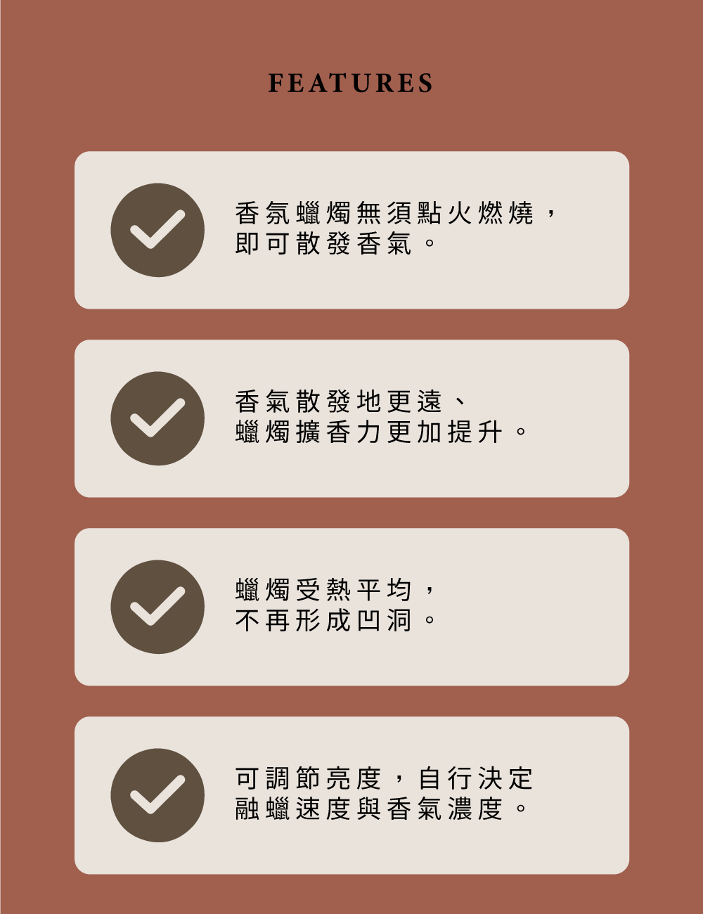 燈罩為簡約俐落的圓柱形,底座防滑貼皮特別挑選軟木材質,更加顯出暖燈整體的設計質感。