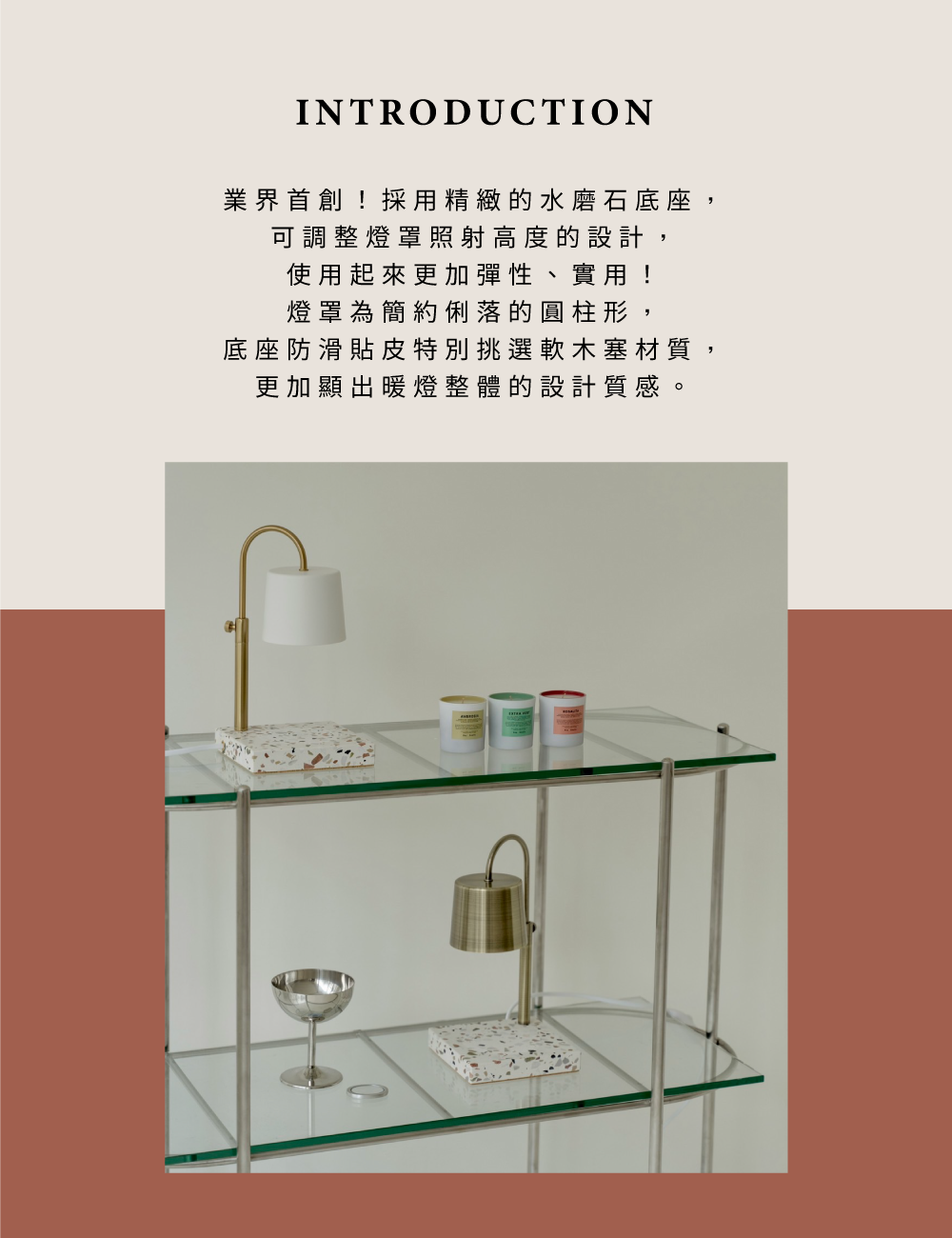 HOOOME 可調升降水磨石款蠟燭暖燈,可調整燈罩照射高度的設計,使用起來更加彈性、實用!