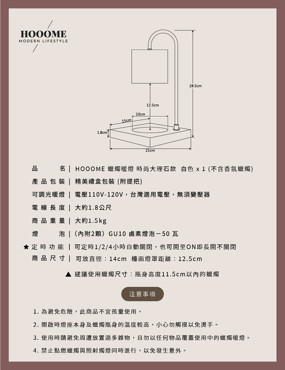 HOOOME 蠟燭暖燈採用天然白色紋路的大理石底座,散發高雅質感