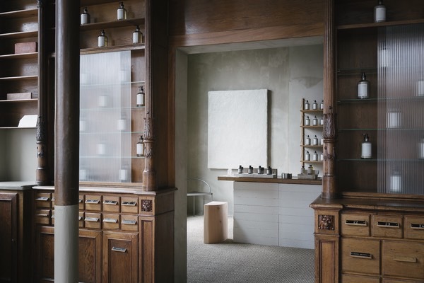 工作室保留老藥房的結構,原始的橡木內裝、金屬裝飾與採光,結合自然與幾何美學,將歷史與現代並存,打造出獨特的品牌風格。
