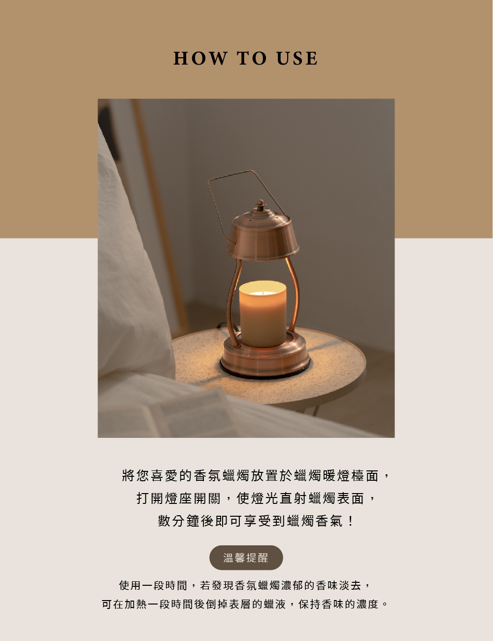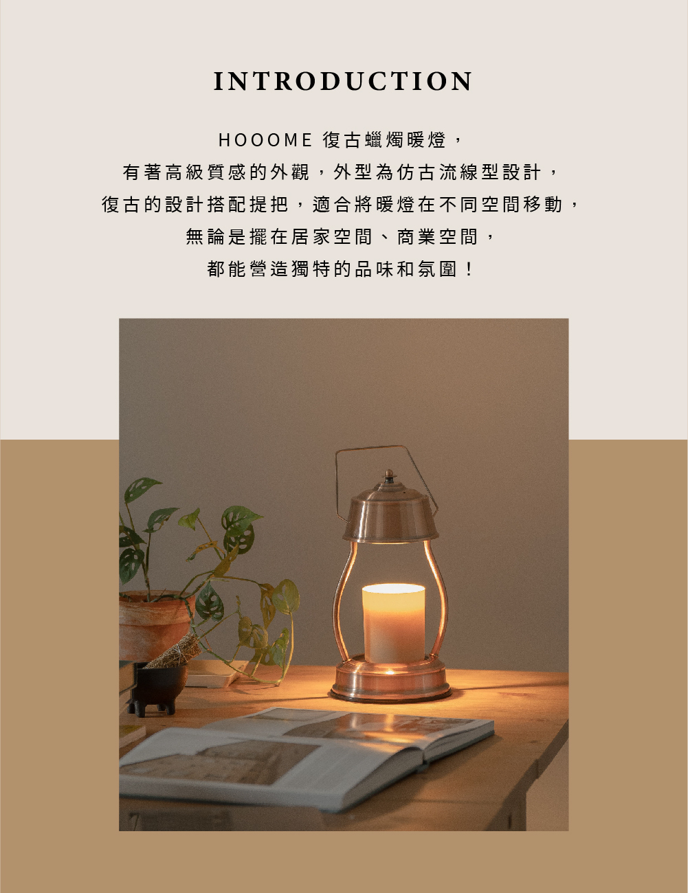 外型為復古流線型設計、搭配提把,適合將暖燈在不同空間移動使用